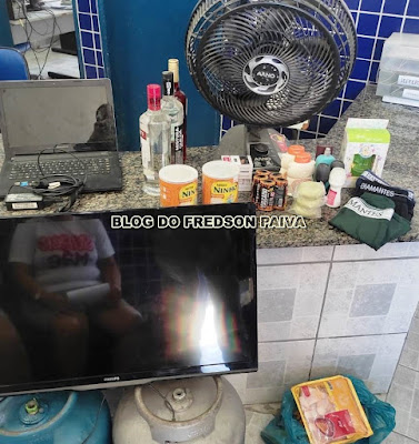 MATERIAIS APREENDIDOS: 02 - botijão de gás, 01 - TV da marca Philips 32 Polegadas, 01 - Ventilador da marca Arno, 01 - Notebook da marca Lenovo, 02 - litros de Vodka, 01 - Litro de Campari, 11 - Produtos cosméticos, 01 - Mídia Box, 03 - Cuecas da marca da marca Diamante, 05 - Mine energético, Vulcano, 01 - Bomba para encher pneu, 05 - carteira de cigarro, 02 - Bandejas de asa de frango, 01 - Bandeja de miúdo de frango, 01 - frango congelado, R$ 2,00 em moedas, RESULTADO DA OCORRÊNCIA: Auto de Prisão em Flagrante Delito. DISQUE DENUNCIA (87) 9 8835-2262.