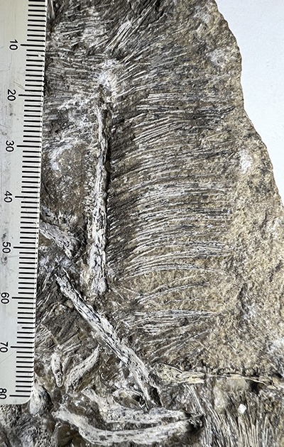 Restos estavam aglutinados em uma massa compacta, composta de partes fragmentadas de pterossauros e peixes. Dentes finos e alongados podem ter causado uma "indigestão" no dinossauro, que expeliu o conteúdo alimentar - Foto: Aline Ghilardi/cedida pela pesquisadora